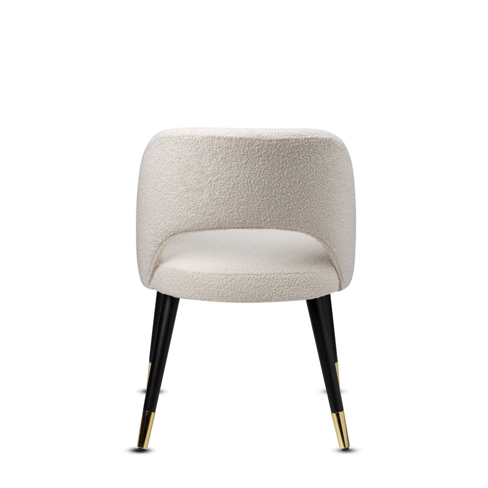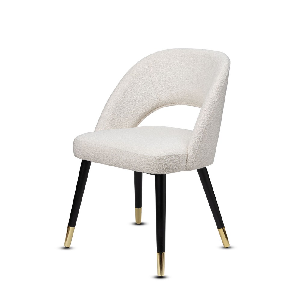 Siyah ahşap ayaklar üzerinde yer alan gold metal uçlar, sandalye tasarımına lüks bir vurgu ekler. 42 DNS yüksek yoğunluklu sünger dolgusu sayesinde uzun süreli oturumlarda dahi formunu korur. Döşemesi silinebilir özellikte olup, restoran ve kafe gibi yoğun kullanılan mekanlarda hijyen ve temizlik kolaylığı sağlar.