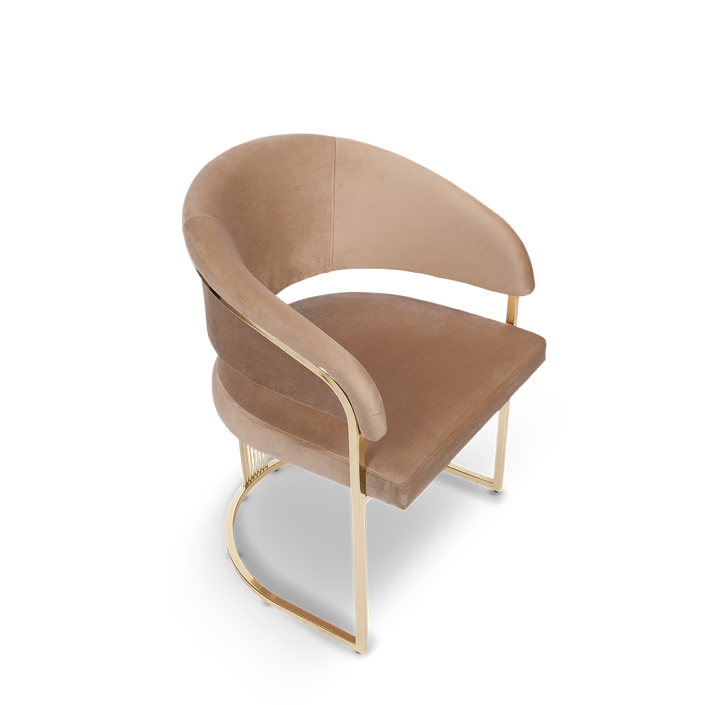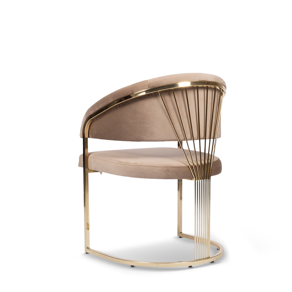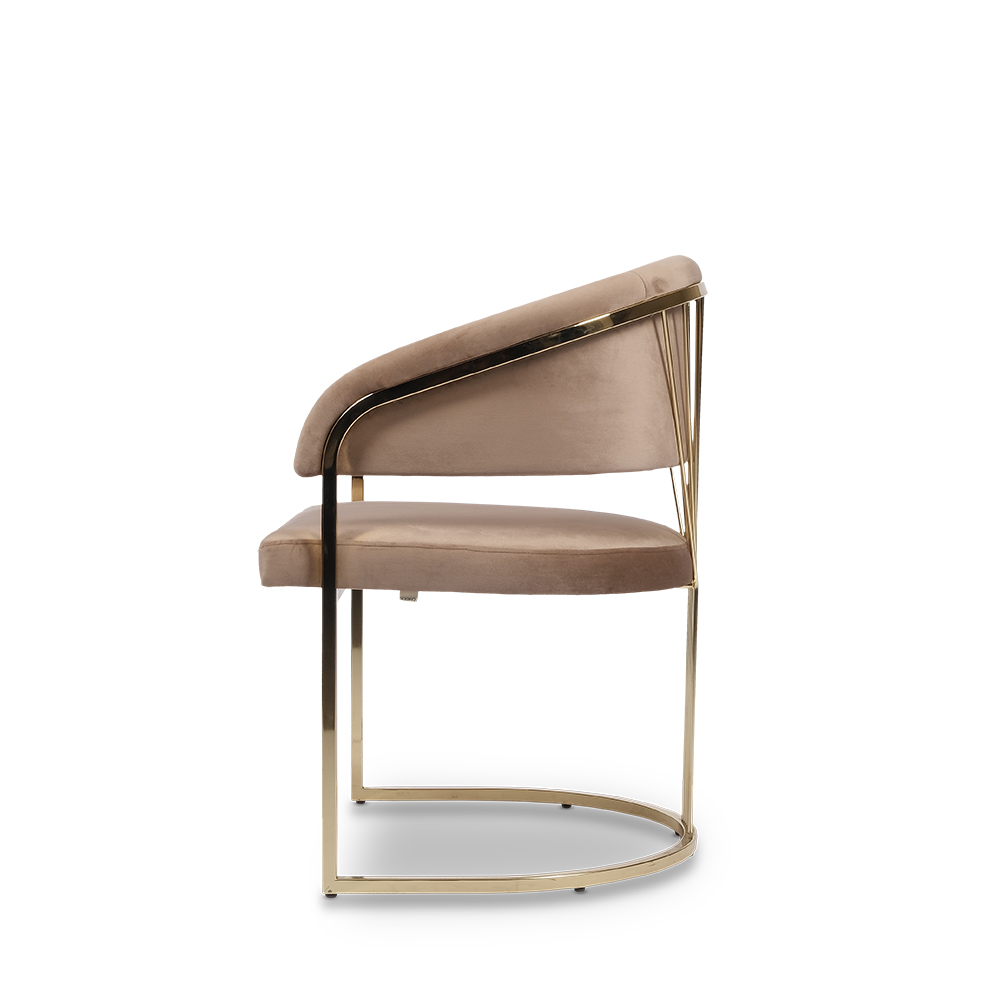 Restoran sandalyeleri, işletmenizin atmosferini belirleyen en önemli mobilyalardandır. Aurora restoran sandalyesi, altın kaplama metal iskeleti ve yuvarlak hatlı sırt tasarımı ile mekânınıza sofistike bir görünüm kazandırır. Bej kadife döşemesi, hem görsel olarak şık hem de oturumda yumuşak bir konfor sunar.