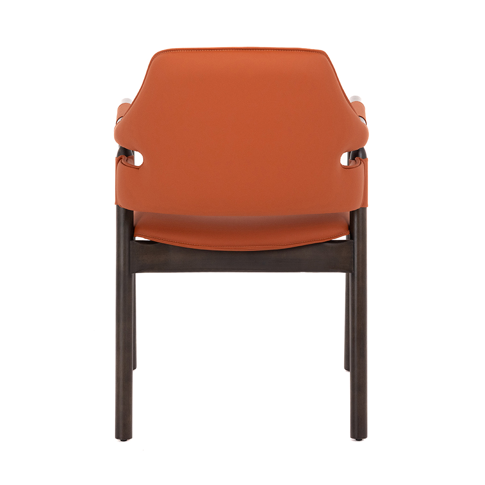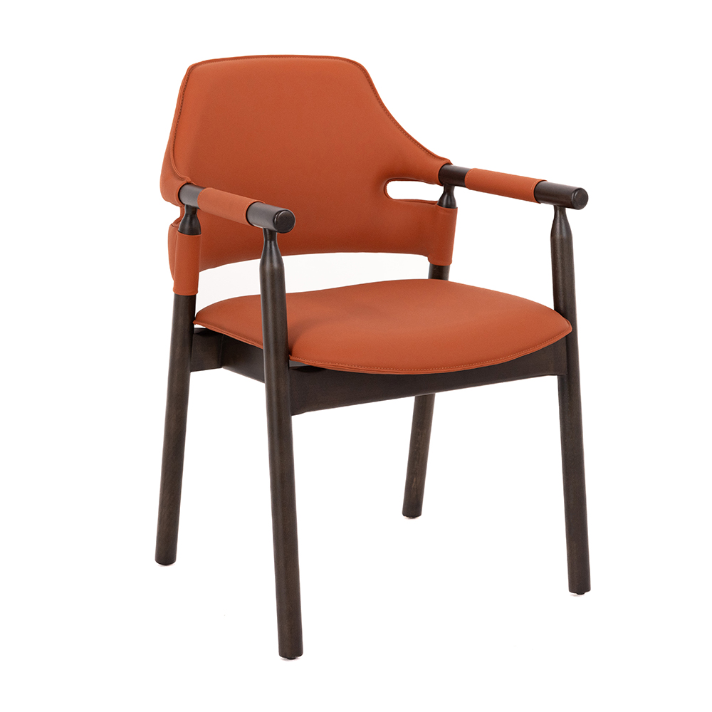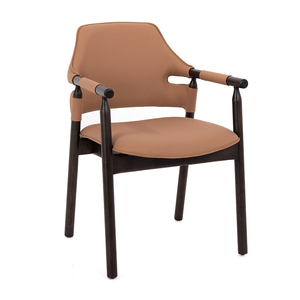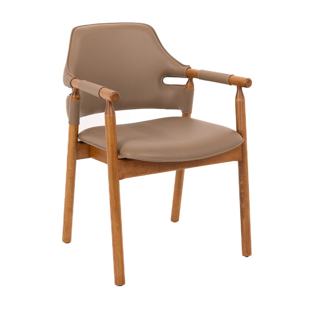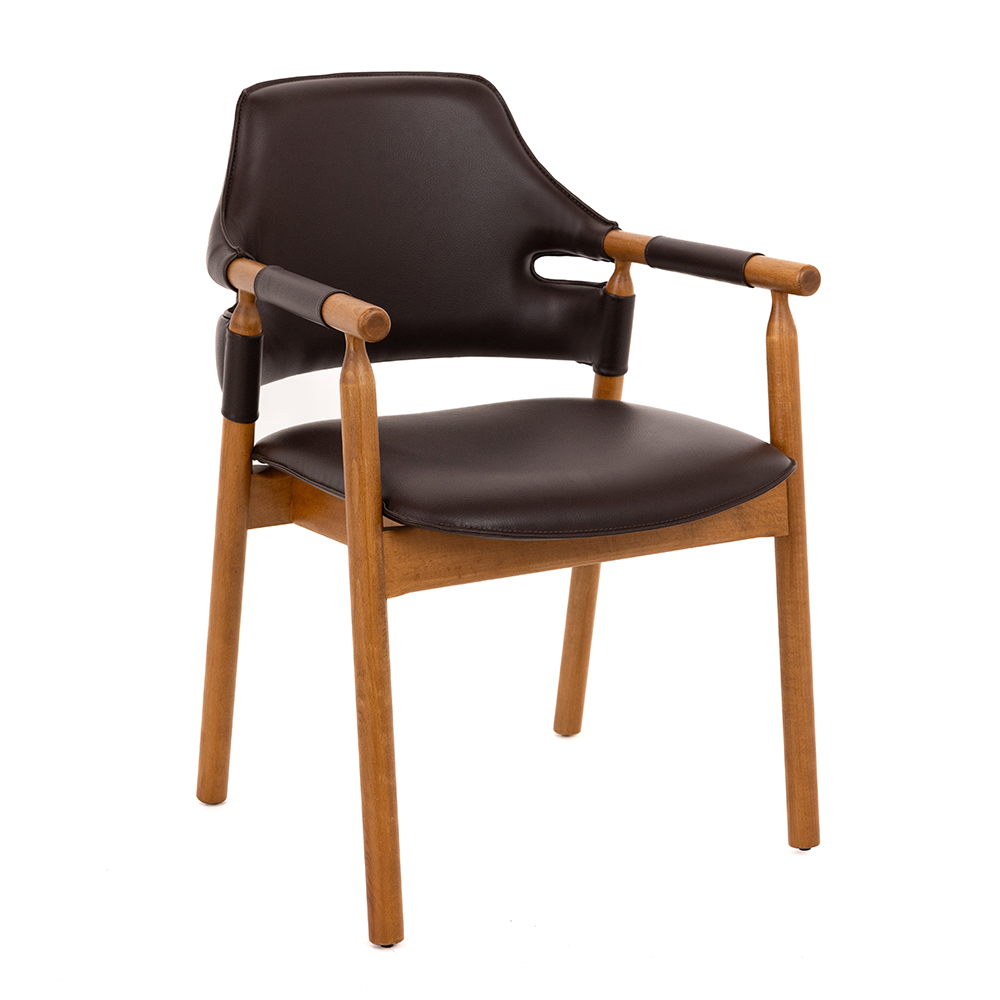Saron Restoran Sandalyesi, yumuşak deri döşemesi ve zarif kavisli kol formuyla oturum konforunu artırır. Masif gürgen gövde, doğal cila ile korunur.